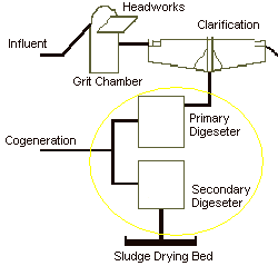 Cogeneration refers to the use of methane, produced in the metabolic digestion of organic material to creating heat and/ or electrical power. The use of Combined Heat and Power (CHP) illustrates the potential for the reduction of energy consumption in treatment of wastewater and the creation of electricity for municipal grids. The Environmental Protection Agency (EPA) diagrams the process in Figure 4, WWTF refers to wastewater treatment facility: