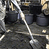 Then the gutter mold is turned over, dirt is compacted against the sides of the mold which is then lifted off.
