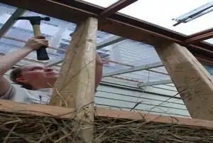 - Prep Wood: because we live in Humboldt County, we want to prep our wood to resist mold before we add the grass slip. The moisture from this process can cause mold to grow and decay the wood studs from within. Therefore we give the studs a borax wash (borax dissolved in water) to protect it from mold.