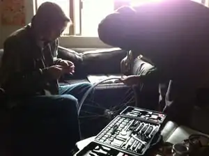 The bike wheel was taken from a donated bike and modified to fit our project. The spokes have been cut off and bent for the graphic inset.