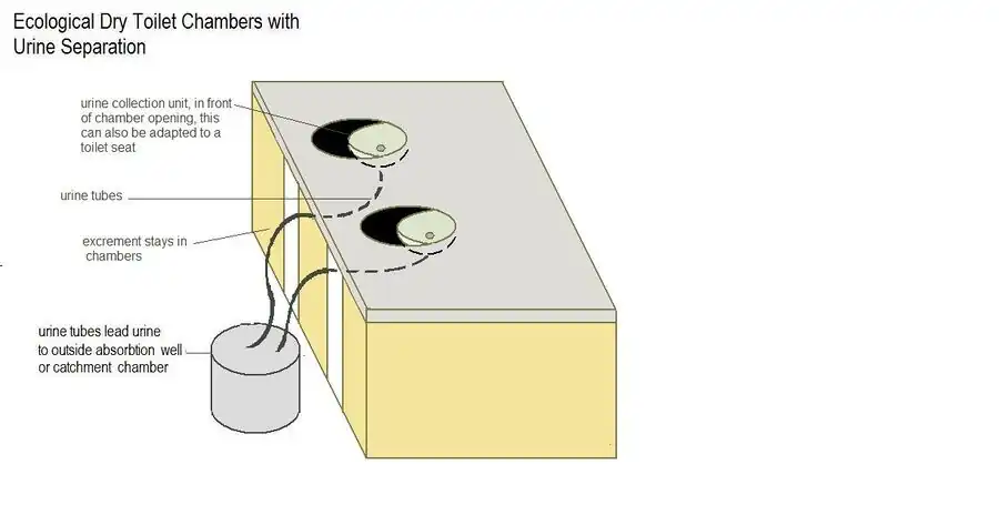 - Whether just the bare hole is used, or a toilet seat is included over the hole, the urine must be separated using a small triangle-shaped cup (or funnel) that has been attached to the underside of the slab, at the front of the hole, and that protrudes out into the hole far enough to capture excreted urine product. This triangular cup (or funnel) should have a small hole set in its bottom for the attachment of a tube via a hose clamp (worm drive screw tightened band clamp) that leads out to an underground external absorption chamber or other separate collection chamber, where it can be collected for use.[2]