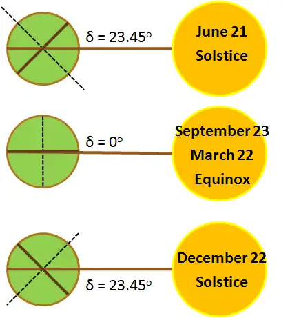 Angle of Declination (δ) = 23.45 sin[ 360 (284 + n) / 365 ]