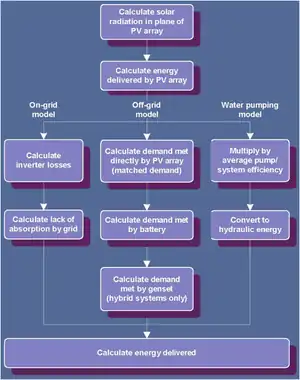 The program works as a plug-in for Microsoft Excel 2000 or higher and includes a built in monthly radiation database from NASA. Simulations can performed for a variety of PV panel types (a-Si, c-Si, etc.) and allows the user to select one of three system types: On-Grid, Off-Grid or Water Pumping model. Figure 6[10] shows the data processing schematic for each type.