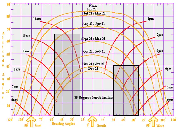 Obstructions can have irregular geometries and be located anywhere in relation to collector surface. By calculating their relative azimuth and altitude angles, a shading profile can be established by overlaying this information onto a solar chart (a solar chart is a graph used to plot the sun's position throughout the year for a given latitude). Figure 5 provides an example of theoretical solar chart and shading profile, where the darkened areas represent when shading will occur. For example, we can read off the chart that the collector will be shaded on October and February 21st between 9:30am and 11:30am and between 2:00pm and 4:30pm.