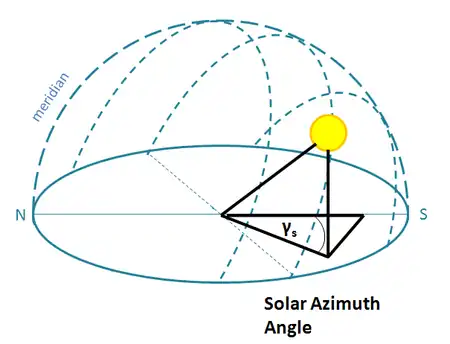 Solar Azimuth Angle (γs) The deviation angle from due South for the projection of the sun's position on the horizontal plane (-180o for Each, +180o for West)