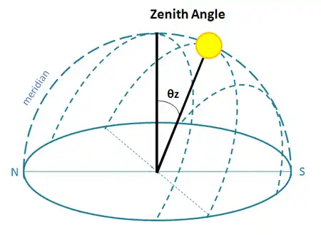 Zenith Angle (θz) The angle between the vertical and the line to the sun. This is also the angle of incidence on a horizontal surface for beam radiation. Additionally, the Solar Altitude angle is defined as the compliment of the zenith angle.