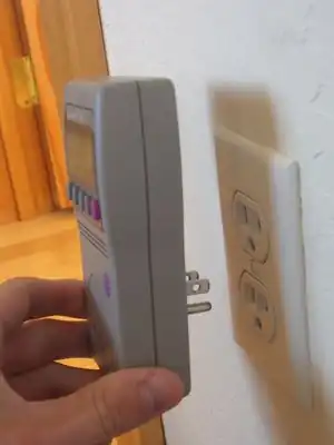 Figure 1. KillAWatt meter plugged into an outlet. The screen displays the voltage reading of the outlet. (Photo by B. Sanders)