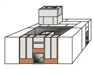 Over the 5"x5" hole left towards the rear of the stove, build a brick tower to lift the chimney, as indicated in the drawing. Next, seal the front wall of the stove to create teh cavity which will hold the insulation. The entire structure should be solid, leveled and square.