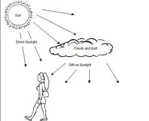 Solar radiation arrives on the surface of the earth at a maximum power density of approximately 1 kilowatt per metre squared (kW/m2). The actual usable radiation component varies depending on geographical location, cloud cover, hours of sunlight each day, etc. In reality, the solar flux density (same as power density) varies between 250 and 2500 kilowatt hours per metre squared per year (kWh/m2 per year). As might be expected the total solar radiation is highest at the equator, especially in sunny, desert areas. Solar radiation arrives at the earth's outer atmosphere in the form of a direct beam. This light is then partially scattered by cloud, smog, dust or other atmospheric phenomenon (see Figure 1 below). We therefore receive solar radiation either as direct radiation or scattered or diffuse radiation, the ratio depending on the atmospheric conditions. Both direct and diffuse components of radiation are useful, the only distinction between the two being that diffuse radiation cannot be concentrated for use.