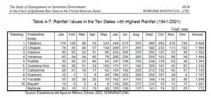 This table shows rainfall data for the 10 rainiest states of Mexico in millimeters both by monthly averages and yearly totals