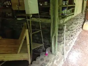 | Methane is collected from the anaerobic digestion and piped to the kitchen. This is a bucket between the biodigester and the kitchen used to catch liquid particles that make it through the pipe. | |