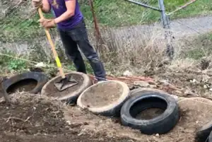Pack the first row! It is most efficient to have one person shoveling scoops of earth into the tire while one person packs it using a tamper, sledge hammer, or similar tool. If the local soil is particularly dry it is best to lightly dampen the soil to help it bind to itself.