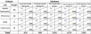- Cost: Another criteria for the final design was that it remained within a chosen budget. CMF Design designated $150 to be the most that a single unit should cost to build. The team wanted to ensure that no undue burden was placed on SRCHS in recreating the final product, if they choose to do so. It was known that the school would have to build multiple barriers, and knowing this, the team wanted the cost for each to be kept low.