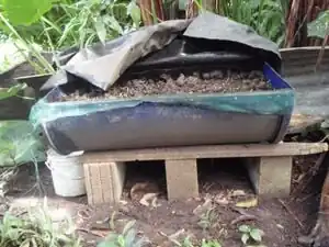 2. Once a storage area is obtained, puncture holes in the lid (if present) and bottom to allow airflow and fluid drainage. If composting in a house, the bin should be elevated to allow drainage of fluid. A set of bricks works nicely. You will also want to put something under the bin to catch fluid.