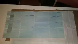 Cut out boning pieces from card paper. 60 trapezoids 1cm thick, 9" long pieces with sides at 45-degree angles and 60 rectangles 1cm thick, and 9" long.