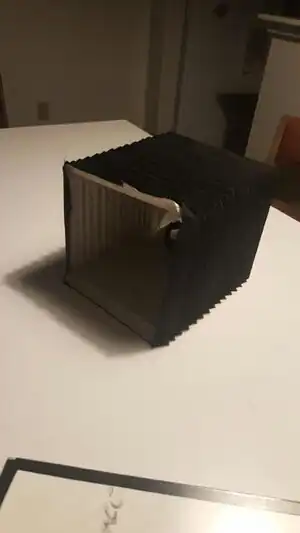 To build the Accordion Camera Obscura, an enclosing box and bellows will have to be built separate. Once the enclosed box and bellows are complete, the next step will be to attach the bellows to the enclose box on one side. On the other side the lens box holding the lens will be attached. The lens box is a plain box with a width of 3".