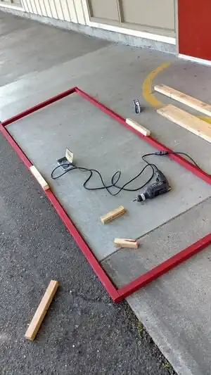 Assembly of roof frame. A roof frame was constructed to hold the corrugated roof together as well as provide a way to attach hinges to the roof so it can be opened and closed. The frame and big hinges used also provides support to the heavy roof so it can be safely opened.