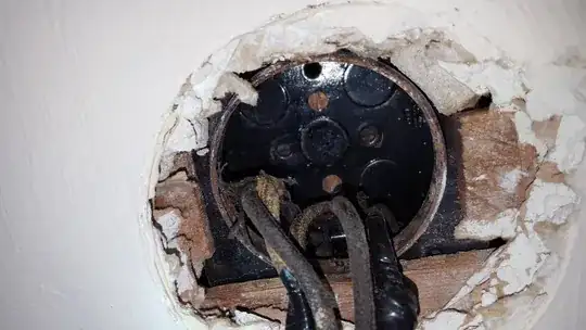 I rent an old 1920's built house where an old hanging light fixture junction box was covered with a blank panel. I want to hang a ceiling fan in this living room, but when exposed I see this old junction box that is really in the plaster and would be a huge hassle to replace.