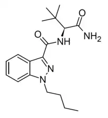 ADB-BUTINACA (also known as ADMB-BINACA using EMCDDA naming standards[3]) is a synthetic cannabinoid compound which has been sold as a designer drug.[4][5][6][7][8] It is a potent CB1 agonist, with a binding affinity of 0.29nM for CB1 and 0.91nM for CB2, and an EC50 of 6.36 nM for CB1.[9][10][11][12][13][14][15]