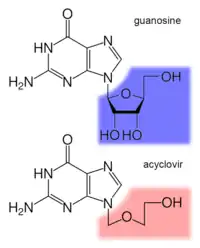- ↑ Elion, Gertrude; Furman PA; Fyfe, James A.; De Miranda, Paulo; Beauchamp, Lilia; Schaeffer, Howard J. (1977). "Selectivity of action of an antiherpetic agent, 9-(2-hydroxyethoxymethyl)guanine". Proc Natl Acad Sci USA. 74 (12): 5716–5720. Bibcode:1977PNAS...74.5716E. doi:10.1073/pnas.74.12.5716. PMC 431864. PMID 202961.