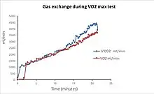 V̇O2 max (also maximal oxygen consumption, maximal oxygen uptake or maximal aerobic capacity) is the maximum rate of oxygen consumption attainable during physical exertion.[1][2] The name is derived from three abbreviations: "V̇" for volume (the dot over the V indicates "per unit of time" in Newton's notation), "O2" for oxygen, and "max" for maximum and usually normalized per kilogram of body mass. A similar measure is V̇O2 peak (peak oxygen consumption), which is the measurable value from a session of physical exercise, be it incremental or otherwise. It could match or underestimate the actual V̇O2 max. Confusion between the values in older and popular fitness literature is common.[3] The capacity of the lung to exchange oxygen and carbon dioxide is constrained by the rate of blood oxygen transport to active tissue.