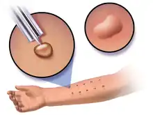 There are two types of skin tests that are commonly used for diagnosing allergies. The first one done is the skin prick test, which can identify most allergens.[4] This test involves pricking a needle through a drop of each control and allergen test solutions into the child’s skin.[4] The intradermal test may be done second if no allergen is identified with the skin prick test.[4] This test is more sensitive and involves injecting tiny amounts of the control and allergen test solutions into the child’s skin with a needle.[4] For either test, any allergies will result with a wheal and flare reaction (swelled center and surrounding circular red area) at the pinprick site.[4] For accurate results, any child undergoing either test will need to stop taking any drugs/medications that may suppress a reaction.[4]
