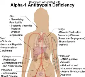 Apart from COPD and chronic liver disease, α1-antitrypsin deficiency has been associated with necrotizing panniculitis (a skin condition) and with granulomatosis with polyangiitis in which inflammation of the blood vessels may affect a number of organs but predominantly the lungs and the kidneys.[10]