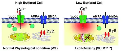 Low Ca2+ buffering and excitotoxicity under physiological stress and pathophysiological conditions in motor neuron (MNs)