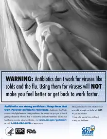Several organizations concerned with antimicrobial resistance are lobbying to eliminate the unnecessary use of antibiotics.[81] The issues of misuse and overuse of antibiotics have been addressed by the formation of the US Interagency Task Force on Antimicrobial Resistance. This task force aims to actively address antimicrobial resistance, and is coordinated by the US Centers for Disease Control and Prevention, the Food and Drug Administration (FDA), and the National Institutes of Health, as well as other US agencies.[87] A non-governmental organization campaign group is Keep Antibiotics Working.[88] In France, an "Antibiotics are not automatic" government campaign started in 2002 and led to a marked reduction of unnecessary antibiotic prescriptions, especially in children.[89]