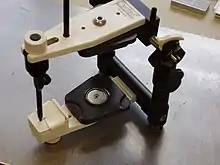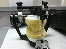 An articulator is a mechanical hinged device used in dentistry to which plaster casts of the maxillary (upper) and mandibular (lower) jaw are fixed, reproducing some or all the movements of the mandible in relation to the maxilla. The human maxilla is fixed and the scope of movement of the mandible (and therefore the dentition) is dictated by the position and movements of the bilateral temperomandibular joints, which sit in the glenoid fossae in the base of the skull. The temperomandibular joints are not a simple hinge but rotate and translate forward when the mouth is opened.