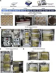 In 2016, scientists published two studies regarding human embryos developing for thirteen days within an ecto-uterine environment.[3][4] Currently, a 14-day rule prevents human embryos from being kept in artificial wombs longer than 14 days. This rule has been codified into law in twelve countries.[5] According to The Washington Post, in 2021 "the International Society for Stem Cell Research relaxed a historical “14-day rule” that said researchers could grow natural embryos for only 14 days in the laboratory, allowing researchers to seek approval for longer studies. Human embryo models are banned from being implanted into a uterus".[6]