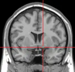 ![]() MRI showing a coronal plane of the head with marks showing the location of the substantia innominata, the region in which the nucleus basalis is found. | |