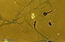 Basidiobolus ranarum is a filamentous fungus with worldwide distribution.[1] The fungus was first isolated by Eidam in 1886. It can saprophytically live in the intestines of mainly cold-blooded vertebrates and on decaying fruits and soil. The fungus prefers glucose as a carbon source and grows rapidly at room temperature.[2] Basidiobolus ranarum is also known as a cause of subcutaneous zygomycosis,[3][4] usually causing granulomatous infections on a host's limbs.[5] Infections are generally geographically limited to tropical and subtropical regions such as East and West Africa.[6] Subcutaneous zygomycosis caused by B. ranarum is a rare disease and predominantly affects children and males.[5] Common subcutaneous zygomycosis shows characteristic features and is relatively easy to be diagnosed; while, certain rare cases might show non-specific clinical features that might pose a difficulty on its identification.[7] Although disease caused by this fungus is known to resolve spontaneously on its own, there are a number of treatments available.[8]