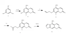 Bergapten is a natural compound coming from plants like the common fig, but it can also be synthesized. Most syntheses of linear furanocoumarins involve starting with a central aromatic unit and adding two heterocyclic rings. Alternate routes of synthesis are desirable to avoid regiochemical problems and moderate yields. The synthesis described here involves Iodine as a removable group to insure regiochemical integrity and convergence.[13] As shown in the diagram, phloroglucinol (compound 1) was the starting material. Mono-methylation was conducted followed by a reaction with ethyl propiolate in the presence of ZnCl2 to yield 7-hydroxy-5-methoxycoumarin (product 3, not shown) with 68% yield. The 8-position of 7-hydroxy-5-methoxycoumarin was then protected by iodine to avoid the formation of an angular furanocoumarin. Product 4 in the diagram is the result of that iodine protection. Product 5 was the result of the allylation of product 4. Osmium tetraoxide and sodium metaperiodate were used to oxidatively cleave the O-allyl derivative onto the aldehyde product 7 via a diol intermediate (product 6, not shown). Cyclization of the aldehyde product 7 using BF3-Et2O in tetra-n-butylammonium bromide was then conducted to construct the furan ring. The final step was to remove the iodine protective group via Pd(OAc)2 to ultimately produce bergapten (product 9) with 90% yield. Synthetic bergapten was isolated as a colorless compound with properties spectroscopically identical to the natural product.