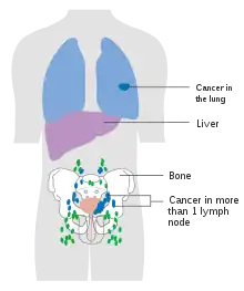 The most common sites for bladder cancer metastases are the lymph nodes, bones, lung, liver, and peritoneum.[76] The most common sentinel lymph nodes draining bladder cancer are obturator and internal iliac lymph nodes. The location of lymphatic spread depends on the location of the tumors. Tumors on the superolateral bladder wall spread to external iliac lymph nodes. Tumors on the neck, anterior wall and fundus spread commonly to the internal iliac lymph nodes.[77] From the regional lymph nodes (i.e. obturator, internal and external lymph nodes) the cancer spreads to distant sites like the common iliac lymph nodes and paraaortic lymph nodes.[78] Skipped lymph node lesions are not seen in bladder cancer.[77]
