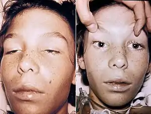 | A 14-year-old with botulism, characterised by weakness of the eye muscles and the drooping eyelids shown in the left image, and dilated and non-moving pupils shown in the right image. This youth was fully conscious. | |