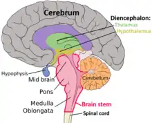 The limbic system, also known as the paleomammalian cortex, is a set of brain structures located on both sides of the thalamus, immediately beneath the medial temporal lobe of the cerebrum primarily in the midbrain.[1] The classification of structures as part of the limbic system is historical and originates from the position of the structures at the boundary between two functionally distinct components (hence, the name limbus, meaning border) and the structures' shared roles in emotional processes (see limbic system for more details). Hence, there is overlap of structures in the limbic system and in other classifications of brain structures. The following areas have been considered part of the limbic system.[2][3]