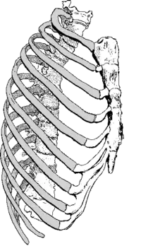 In this view of the rib cage the downward slope of the lower ribs from the midline outwards can be clearly seen. This allows a movement similar to the "pump handle effect", but in this case, it is called the bucket handle movement.