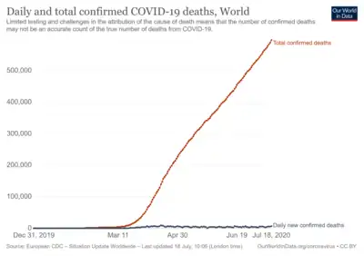 - ↑ Platto S, Xue T, Carafoli E (September 2020). "COVID19: an announced pandemic". Cell Death & Disease. 11 (9): 799. doi:10.1038/s41419-020-02995-9. PMC 7513903. PMID 32973152.