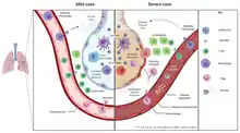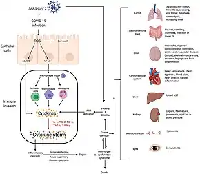 The effect of the virus on ACE2 cell surfaces leads to leukocytic infiltration, increased blood vessel permeability, alveolar wall permeability, as well as decreased secretion of lung surfactants. These effects cause the majority of the respiratory symptoms. However, the aggravation of local inflammation causes a cytokine storm eventually leading to a systemic inflammatory response syndrome.[83]