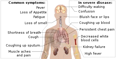 Symptoms of COVID-19 are variable, ranging from mild symptoms to severe illness.[19][20] Common symptoms include headache,[21] loss of smell[22] and taste,[23] nasal congestion and runny nose, cough, muscle pain, sore throat, fever,[24] diarrhea, and breathing difficulties.[25] People with the same infection may have different symptoms, and their symptoms may change over time. Three common clusters of symptoms have been identified: one respiratory symptom cluster with cough, sputum, shortness of breath, and fever; a musculoskeletal symptom cluster with muscle and joint pain, headache, and fatigue; a cluster of digestive symptoms with abdominal pain, vomiting, and diarrhea.[25] In people without prior ear, nose, and throat disorders, loss of taste combined with loss of smell is associated with COVID-19.[26]