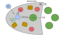 A centroblast generally refers to an activated B cell that is enlarged (12–18 micrometer) and is rapidly proliferating in the germinal center of a lymphoid follicle.[1] They are specifically located in the dark zone of the germinal center.[2] Centroblasts form from naive B cells being exposed to follicular dendritic cell cytokines, such as IL-6, IL-15, 8D6, and BAFF. Stimulation from helper T cells is also required for centroblast development. Interaction between CD40 ligand on an activated T helper cell and the B cell CD40 receptor induces centroblasts to express activation-induced cytidine deaminase,[3] leading to somatic hypermutation, allowing the B cell receptor to potentially gain stronger affinity for an antigen. In the absence of FDC and helper T cell stimulation, centroblasts are unable to differentiate and will undergo CD95-mediated apoptosis.[4]