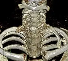 A cervical rib in humans is an extra rib which arises from the seventh cervical vertebra. Their presence is a congenital abnormality located above the normal first rib. A cervical rib is estimated to occur in 0.2%[2] to 0.5%[3] (1 in 200 to 500) of the population.[4] People may have a cervical rib on the right, left or both sides.[5][6]