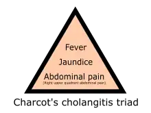 Charcot's cholangitis triad is the combination of jaundice; fever, usually with rigors; and right upper quadrant abdominal pain. It occurs as a result of ascending cholangitis (an infection of the bile duct in the liver). When the presentation also includes low blood pressure and mental status changes, it is known as Reynolds' pentad.[1] It is named for Jean-Martin Charcot.[2]