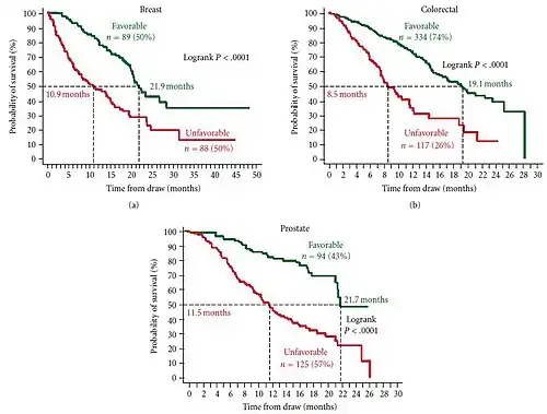 To date, a variety of research methods have been developed to isolate and enumerate CTCs.[38] The only U.S. Food and Drug Administration (FDA) cleared methodology for enumeration of CTC in whole blood is the CellSearch system.[39] Extensive clinical testing done using this method shows that presence of CTCs is a strong prognostic factor for overall survival in patients with metastatic breast, colorectal or prostate cancer.[7][40][41][42][43][44][45]