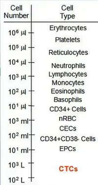 Circulating tumor cells are found in frequencies on the order of 1-10 CTC per mL of whole blood in patients with metastatic disease.[27] For comparison, a mL of blood contains a few million white blood cells and a billion red blood cells. This low frequency, associated to difficulty of identifying cancerous cells, means that a key component of understanding CTCs biological properties require technologies and approaches capable of isolating 1 CTC per mL of blood, either by enrichment, or better yet with enrichment-free assays that identify all CTC subtypes in sufficiently high definition to satisfy diagnostic pathology image-quantity requirements in patients with a variety of cancer types.[18] To date CTCs have been detected in several epithelial cancers (breast, prostate, lung, and colon)[28][29][30][31] and clinical evidences indicate that patients with metastatic lesions are more likely to have CTCs isolated.