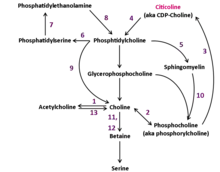 • The Kennedy pathway, which includes the transformation of choline to citicoline, by way of phosphorylcholine, produces phosphatidylcholine when condensed with diacylglycerol.