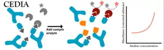 A cloned enzyme donor immunoassay (CEDIA) is a competitive homogenous enzyme immunoassay.[1] This assay makes use of two component fragments of an enzyme which are each individually inactive. Under the right conditions in solution these fragments can spontaneously reassemble to form the active enzyme. For use in biochemical assays, one of the enzyme fragments is attached to an analyte of interest. The analyte-enzyme-fragment-conjugate is still able to reassemble with the other enzyme fragment to form an active enzyme. However it is unable to do this if the analyte is bound to an antibody.