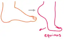 Equinus: the foot is pointed downward, forcing one to walk on tiptoe. This motion occurs naturally, but in clubfoot the foot is fixed in this position. This is because the Achilles tendon is tight and pulls the foot downwards. |