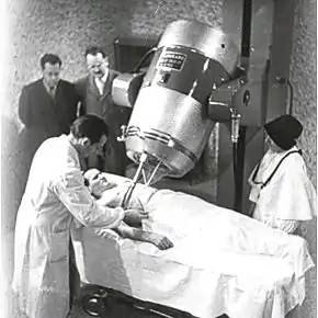 In 1949, Dr. Harold E. Johns of the University of Saskatchewan sent a request to the National Research Council (NRC) of Canada asking it to produce cobalt-60 isotopes for use in a cobalt therapy unit prototype. Two cobalt-60 apparatuses were then built, one in Saskatoon in the cancer wing of the University of Saskatchewan and the other in London, Ontario. Johns collected depth-dose data at the University of Saskatchewan which would later become the world standard.[3] The first patient to be treated with cobalt-60 radiation was treated on October 27, 1951, at the War Memorial Children's Hospital in London, Ontario.[4][5] In 1961 cobalt therapy was expected to replace X-ray radiotherapy.[6]:14 In 1966, Walt Disney's lung cancer was treated with this procedure, but could not prevent his death.[7]